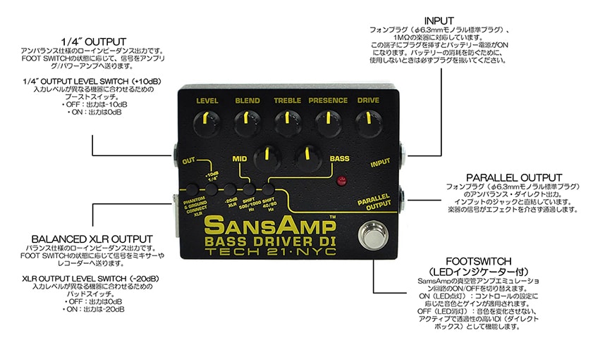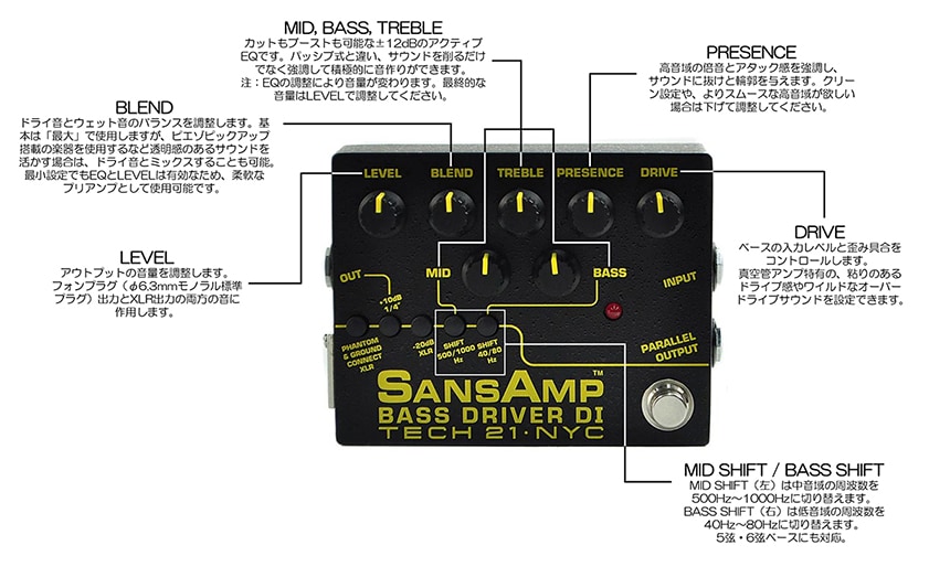 一世を風靡したベース用プリアンプSansamp/Bass Driver DI。多くのベーシストが一度はお世話になる機材の一つといっても過言ではありません。そのSansamp/Bass Driver DIがバージョン2となってリニューアルされました。最大の変更点はミッドコントロールの搭載。旧モデルでもミッドの調整は可能でしたが、トレブルとベースのカット/ブーストにより自動でミッドのレベルが決まるというものでした。バージョン2では新たに独立したミッドコントロールが搭載されているので、音作りの幅は格段に向上しています。