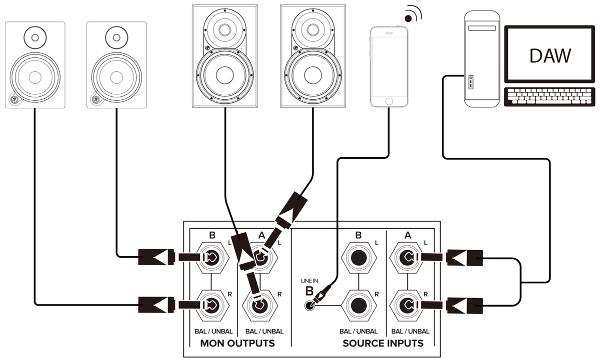 この例では、お使いのDAWがインストールされたPCのアナログ音声出力を、Big Knob Passiveの「Source Inputs A‒ L/R」端子に接続しています。「Source Input B」には、標準フォン端子(1/4インチ)に加えて、ステレオミニフォン端子(1/8インチ)も搭載されており、どちらにも入力が可能です。両方の端子にソースが接続されている場合は、1/8インチのステレオミニフォン端子の信号が優先されます。この例では、スマートフォンの音声出力をステレオミニフォン端子に接続しています。