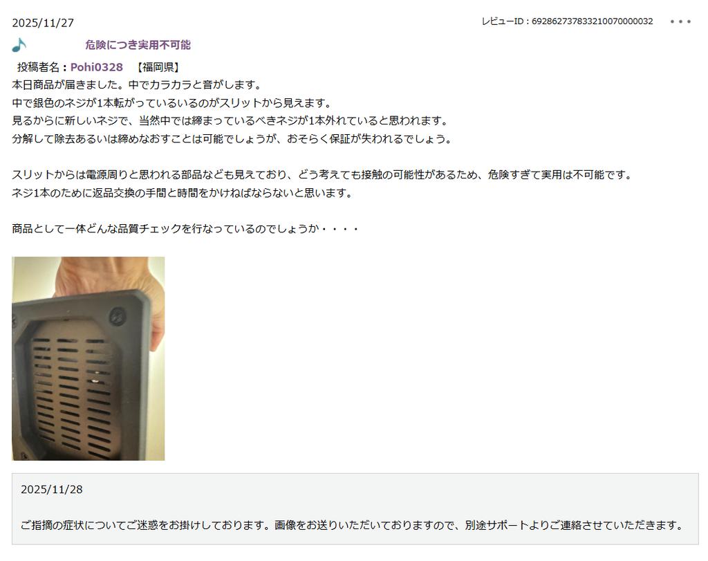 非常に危険な初期不良遭遇と不快な購買体験をしたため、レビューを編集いたします。