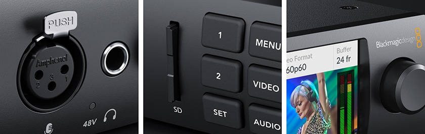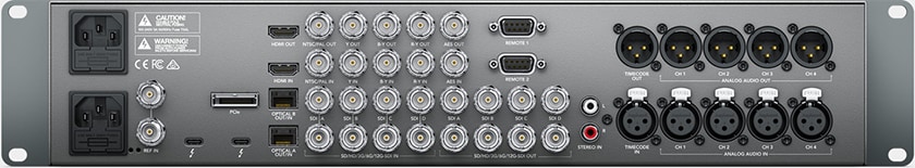 UltraStudio 4Kモデルは、エレガントなフロントパネルにカラーLCDおよび高速コントロールが可能なボタンを搭載。リアパネルには、ビデオ接続用に業界標準のBNCおよびHDMIコネクターを搭載しています。UltraStudio Miniモデルは可搬性を重視して設計されており、デスクでの単独使用に加え、他の機材とラックマウントして使用も可能。UltraStudio HD Miniモデルはラック幅の1/3とさらにコンパクトで、デスクに置いても一切目立たず、1Uラックマウントサイズに3台収納できます!
