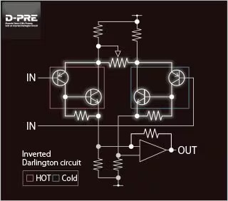 D-PREマイクプリアンプには高級オーディオアンプで使用されてきたインバーテッドダーリントン回路を採用し、その回路は増幅素子を多段構成にすることで、大電流と低インピーダンスを実現しました。