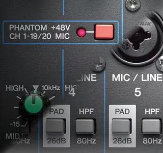 MGシリーズは、ワイドな周波数特性と高音質が特徴のコンデンサーマイクを使用するのに必要なファンタム電源を装備しています。また入力信号のレベルを減衰させるPADボタンも装備。