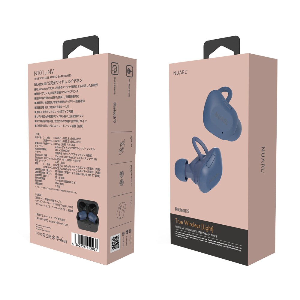 NUARL NT01Lは、人気の完全ワイヤレスイヤホン「NT01」から付属品を必要最低限に抑えることで、よりお求め易くなったライトモデル。カラーリングが変更になった他、低域の厚みを強調した音作りで、重低音やスピード感のある楽曲を好む方に最適な音質にチューニングを施されています。