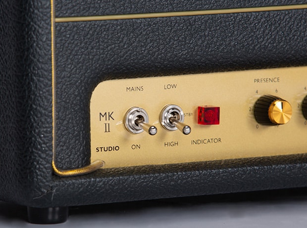 4つ穴のジャック、金属製のピンスイッチ、放熱口のゴールドメッシュ、”PLEXI”の呼び名の元となった樹脂素材のフロントパネル、リイシュー版ではイマイチ不評だった「Mk II」の文字…。ルックスも最高!