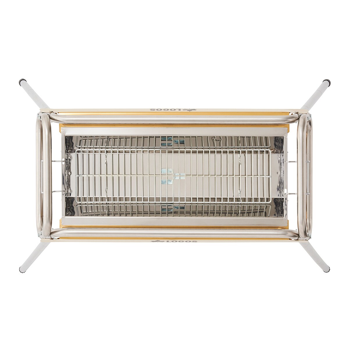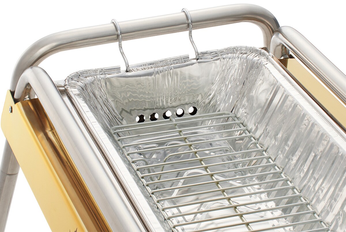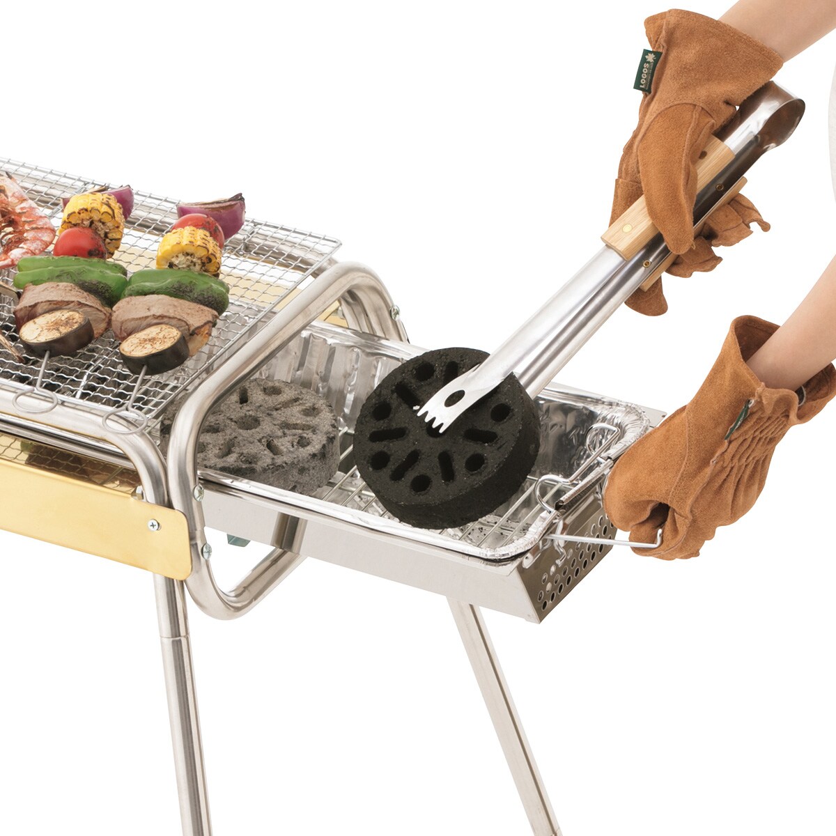 ゴールドのステンレスを使用した高級感のあるグリルで、遠火と近火で火力を使いわけられる。スライド式の火床だから炭の追加が簡単で、それぞれに調理用鉄板が付属。高さ2段階調節が可能。