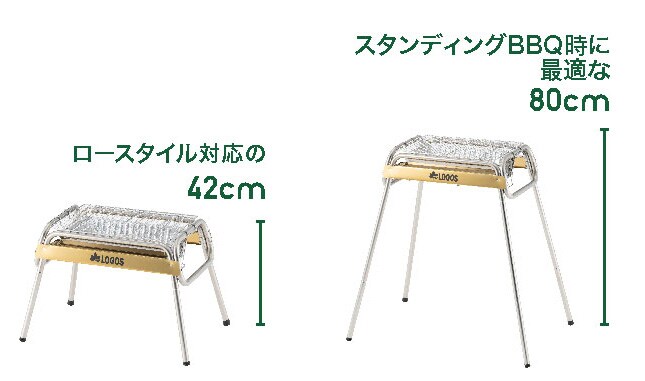 ハイポジションは、立食で使いやすい高さ80cm。あまり、かがむことなくBBQを楽しめるので、立食パーティーに最適です。また、ローポジションは、一般的なアウトドアチェアに座ったままで調理がしやすい高さです。