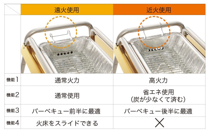 炭の火力が落ちてきたら、火床のフックにかけるだけで焼網に近づき(約2cm)熱効率がUP。