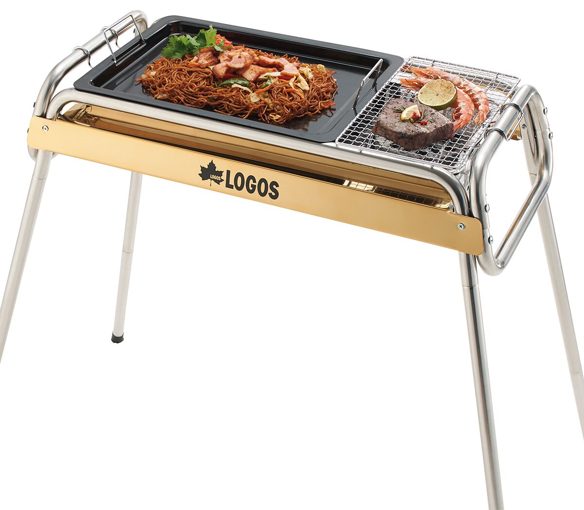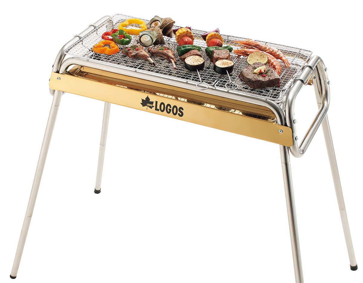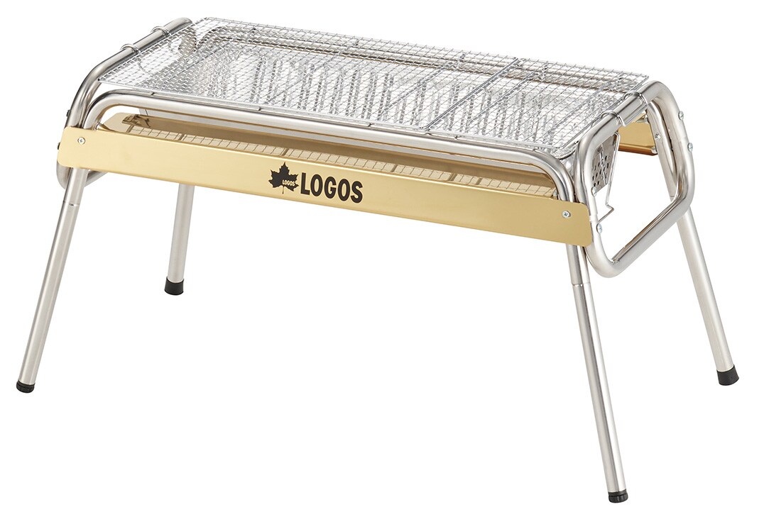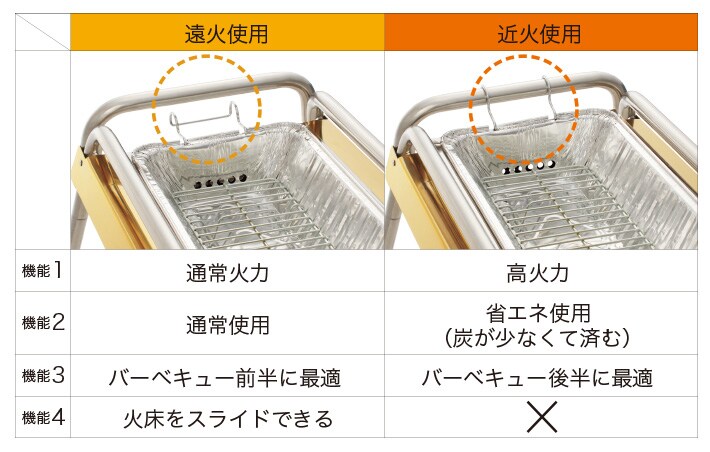 ゴールドのステンレスを使用した高級感のあるグリルで、遠火と近火で火力を使いわけられる。スライド式の火床だから炭の追加が簡単で、それぞれに調理用鉄板が付属。高さ2段階調節が可能。