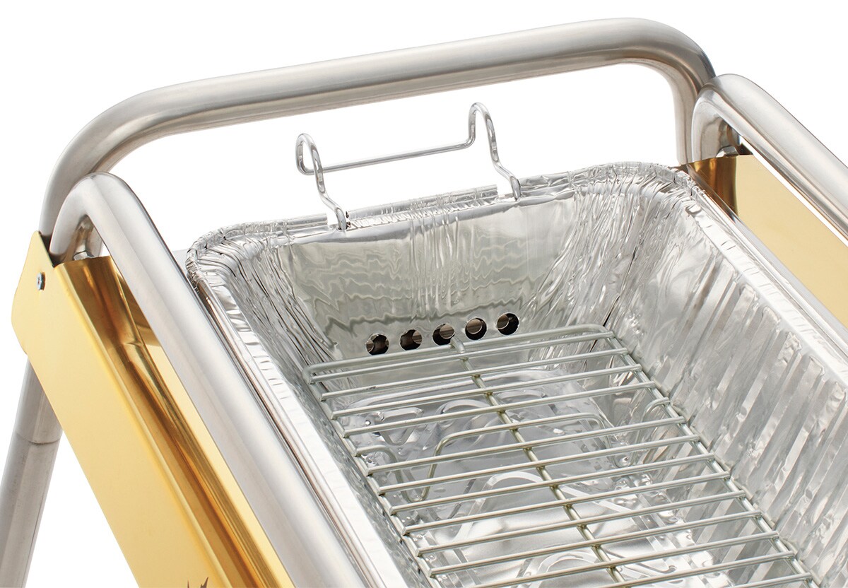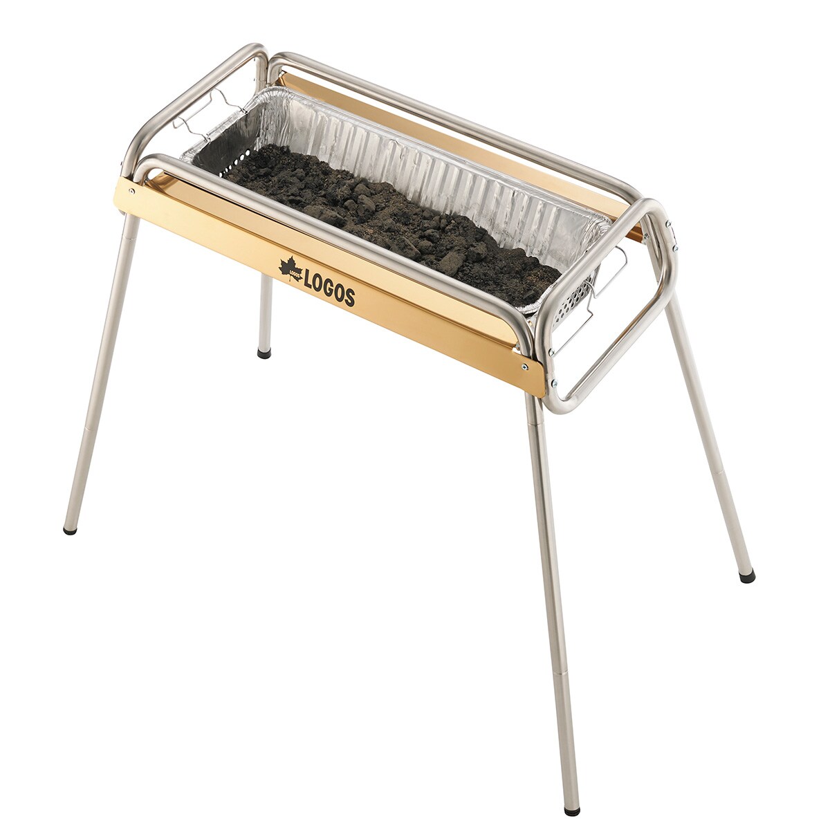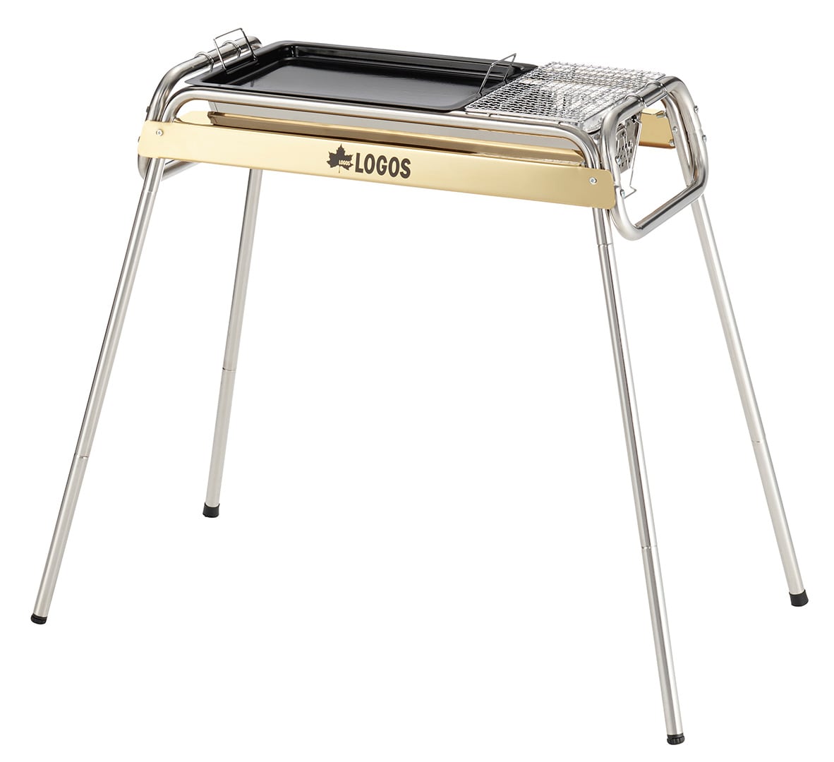 ゴールドのステンレスを使用した高級感のあるグリルで、遠火と近火で火力を使いわけられる。スライド式の火床だから炭の追加が簡単で、それぞれに調理用鉄板が付属。高さ2段階調節が可能。