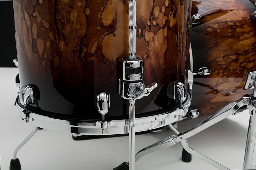 Walnut(ウォルナット)材特有の、中低音域に丸みを帯びた温かみと高級感あふれる芯のあるシェル鳴りに、Birchバーチ材の明瞭な音像とソリッドなアタックを組み合わせたハイブリッドシェルを採用しています。この組み合わせにより、シェル単体の響きを保ちながらも、ドラムセット全体でのサウンドを調和させるフォーカスされた音色を実現。バンド内での存在感を際立たせ、コントロールされたサスティーンと明確な音像、そして何より叩くたびに心地よく感じられる温かな響きを生み出します。