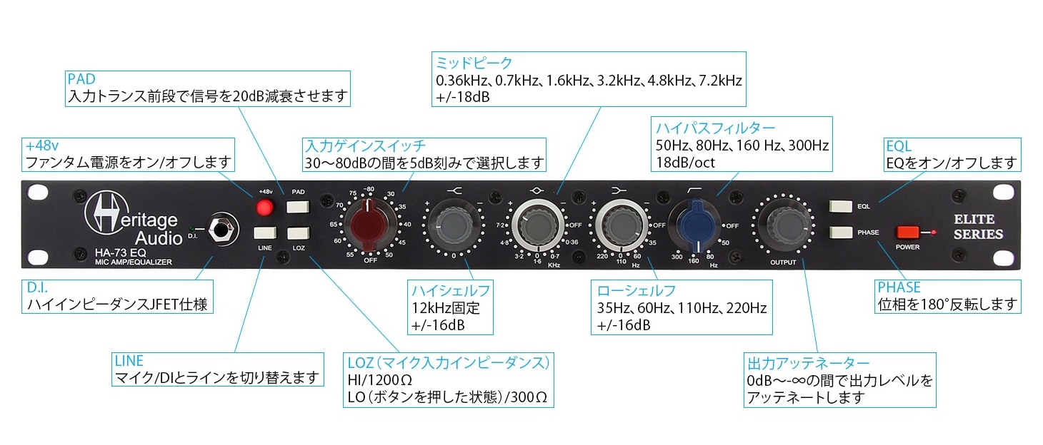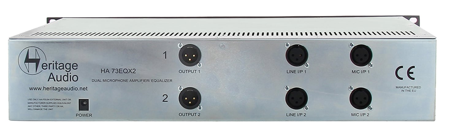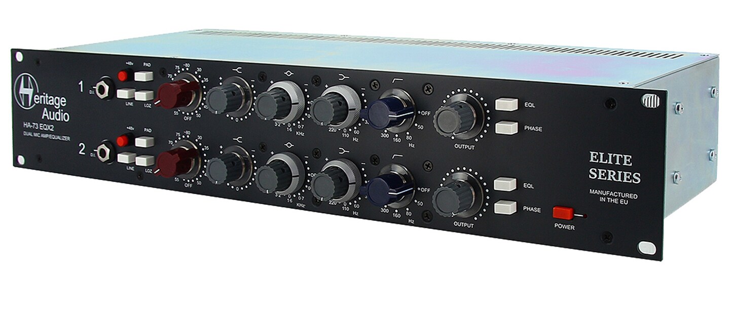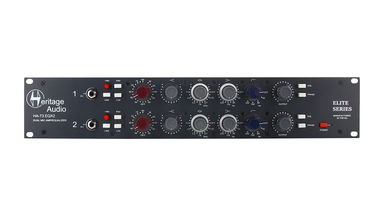 HA73EQX2 Elite のプリアンプセクションには、入力ゲイン、出力トリム、-20 dB パッド、極性反転、+48Vファンタム電源が、またEQセクションには、ハイシェルビングEQ、ミッドレンジEQ、ローシェルビングEQ、可変式ハイパスフィルター、EQバイパスが備わっています。堅牢な1Uサイズのイギリス製スチールおよびアルミニウム製シャーシに身を包み、低ノイズ動作のために外部電源を使用します。