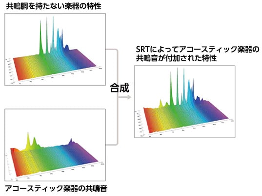 SRT(Studio Response Technology:スタジオ・レスポンス・テクノロジー)パワードシステムとは、サイレントベースのような共鳴胴を持たない楽器の音に対し、アコースティック楽器の音の分析結果をもとにした自然な音色と響き=胴共鳴をリアルタイムで付加するデジタル技術です。