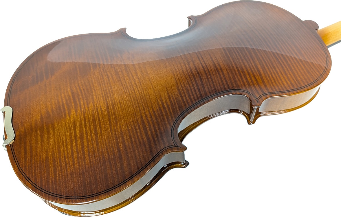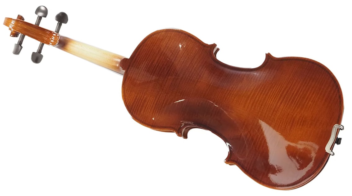 こげ茶の光沢のある艶あり塗装が特徴。美しい木目もお楽しみいただける初心者向けバイオリンです。