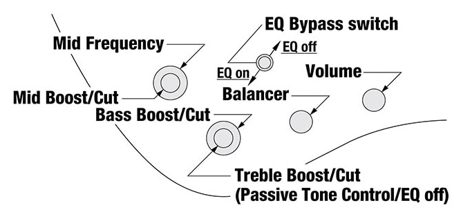 ベースを構えた時に、ボディエンド寄りに並ぶ2つのスタック構造のノブのうち、ボディ中心側にあるノブの上段がミッドブースト/カットノブで、下段がミッドフリークエンシーピーク設定ノブです。ボディ外周側にあるノブの上段がトレブルブースト/カットノブで、下段がベースブースト/カットノブです。このボディ外周側にあるスタック構造のノブを起点にしてネック側に向かって並ぶ2つのノブは、ボディエンド側から順にバランサーノブとボリュームノブです。ボディ中心寄りにあるミニスイッチはEQバイパススイッチで、EQバイパススイッチをネック側に倒すとEQオフ、ボディエンド側に倒すとEQオンになります。トレブルブースト/カットノブはEQオフ時にはパッシブトーンコントロールとして機能します。