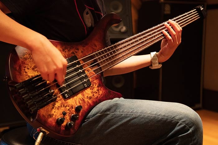 32.5~35インチのマルチスケールは、はじめこそハイフレットに違和感を感じますが、1時間もすれば馴染んでしまいます。むしろハイフレットが上に向かって伸びる構造上、24フレットまで「ネックを握り込んだまま」指が届きます。これに慣れると通常のベースがいかに窮屈な姿勢で弾かれていたのか逆説的に思い知らされました。