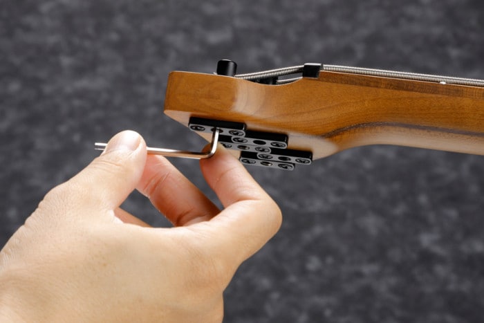 裏側から6角レンチで回すことで、簡単に弦をセット&リリース可能です。