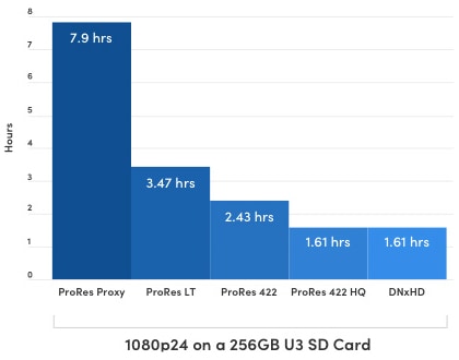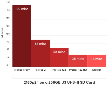 Video Assistは、一般的なSDカードを使用するため、簡単に購入できるフラッシュメモリーカードに収録できます。ファイルサイズが小さいので、標準的なSDカード、あるいは高速のUHS-IIカードに長時間の収録が可能。Video Assist 12Gの7インチモデルは、SDカードスロットを2つ搭載しているため、収録中でもフルになったカードを交換でき、半永久的に収録を継続できます。小型、高速、低価格の標準的なSDカード、あるいはより高速のUHS-IIカードは、放送に最適です。