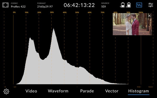 Video Assistはスコープを搭載しているため、カメラの露出を正確にモニタリングしたり、放送基準に準拠しているかどうかを確認できます。つまり、持ち運び可能な波形モニタリング・ソリューションとしても使用できます!波形表示は、ビデオ入力あるいは再生信号の輝度(明るさ)レベルを従来の方法で表示します。ベクトルスコープは、100%のSDIリファレンスレベルで色の強さを確認できます。また、RGBパレード表示にも対応しており、カラーコレクションで役立ちます。ヒストグラムは、イメージ内のホワイトからブラックへのディテールの分布を示しており、ハイライトやシャドウのクリッピングが確認できます。内蔵スコープは、ライブビデオにオーバーレイ表示、またはスコープの右上にピクチャー・イン・ピクチャーで表示できます!