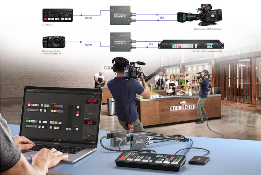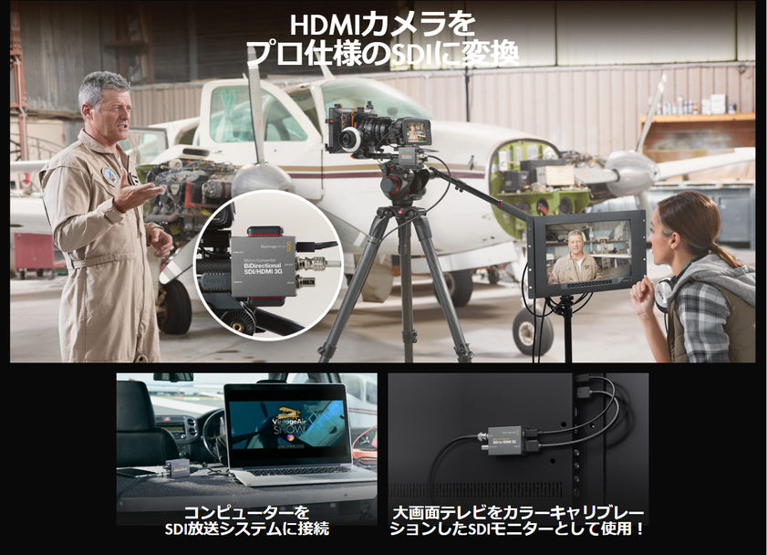 世界最小、放送品質の双方向コンバーター!SDIからHDMI、HDMIからSDIに、異なるフォーマットでも同時に変換できます。カメラコントロールプロトコルの変換にも対応しているため、Blackmagic Pocket Cinema Cameraをプロ仕様のSDIライブプロダクションスイッチャーと使用可能!