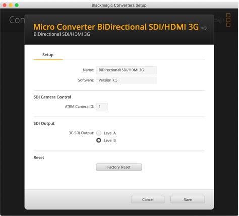 Blackmagic Designウェブサイトから無償でダウンロードできConveter Utilityでは、設定の変更やコンバーターのソフトウェアアップデートが可能。このユーティリティソフトウェアは、Micro ConverterのUSBコネクターで接続でき、MacおよびWindowsコンピューターの両方で使用できます。ユーティリティでは、コンバーターの名前を変更できるため、どのタスクにどのコンバーターを使用しているか識別可能。双方向コンバーターではカメラ番号も設定できるため、ライブプロダクションスイッチャーからコントロールされていることをコンバーターが認識します。また、3G-SDIビデオフォーマットで作業する場合、Level AとLevel Bから選択可能。