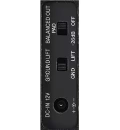 バランスドアウト パッドスイッチは、BALANCED OUTジャックの信号出力を26dB減衰させるスイッチです。小型ミキシングコンソールなど、XLRコネクターのバランス入力にマイクレベルのみを想定している機器に本機を接続する場合、スイッチを「-26dB」側にすることにより、マイクレベルに近い出力とすることができます。