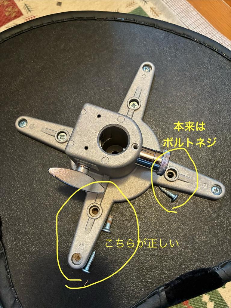 使用しようと思ったらネジが落ちてたので調べたら、座面の裏側のネジが元々違うネジが使われていて、それが締まらずに落ちて来た模様。