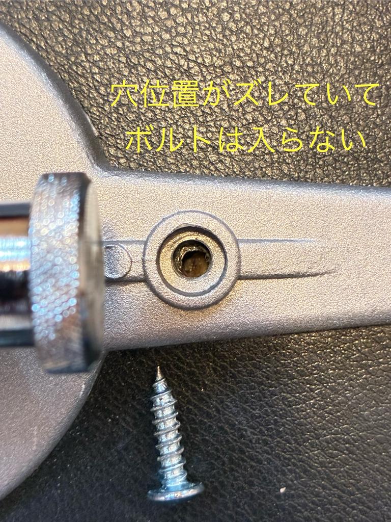 本来ならば他の位置と同じようにボルトが使われるところ、木ネジが入れられており、中を見たら穴位置がずれていてボルトが入らない状態になっています。見た目を誤魔化すために工場が木ネジを差し込んでいただけの状況。