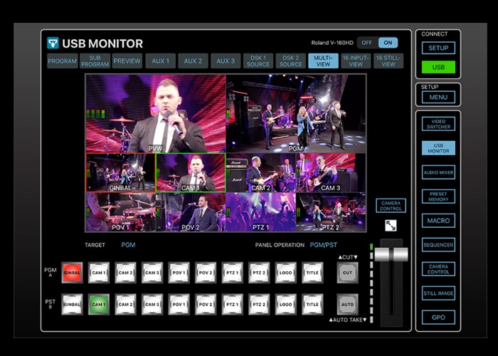 リモートで操作可能なPTZ(パンチルトズーム)カメラは、限られたスペースやカメラオペレーターの配置が難しい場所でも複数のカメラの映像が欲しいときに有効です。V-160HDはLAN経由で接続されたCanon、JVC、Panasonic、Sony、PTZOptics、AvonicおよびVISCA互換の一部のPTZカメラを最大16台まで制御できます。また複数のPTZカメラを接続する場合、異なるメーカーのPTZカメラを混在させても制御が可能なので、既存の設備に最新のPTZカメラを増設するようなスタジオ構築でも複雑な制御システムを用意する必要がありません。またシステム・プログラム Ver.3.00以降、USBテンキーの各ボタンにパンチルトズームの設定やカメラプリセットを登録、呼び出しが可能です。