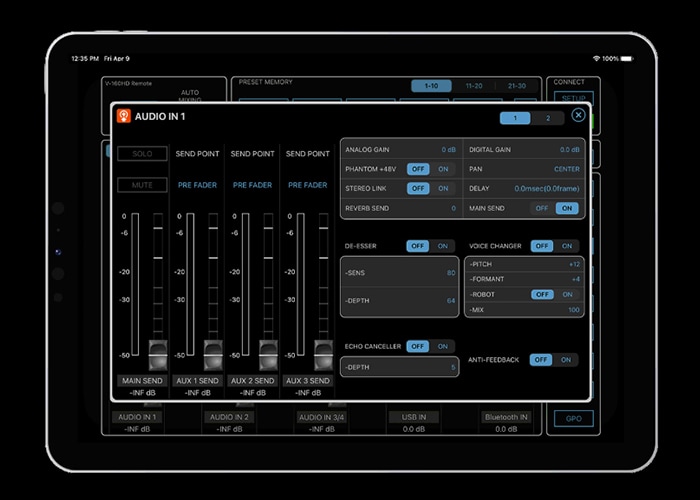 V-160HDはプロフェッショナル品質の40チャンネルのデジタル・オーディオ・ミキサーを搭載。16系統のビデオ音声、2系統のXLRコンボとステレオRCAから接続されたマイク、ラインレベルの機器、USB-Cの音声をミキシング。HDMI/SDIから入力されたエンベデッド・オーディオは4つのステレオペアのうち任意の一つを選択可能です。また本体内蔵のBluetooth経由で接続されたスマートフォンやタブレットから音楽やその他の音源をワイヤレスで再生することが可能です。さまざまな音の問題を解決し、聴きやすい環境を構築するための幅広いサウンド・エフェクトを搭載。ハウリングを防ぐアンチ・フィードバックやエコー・キャンセラー、ノイズゲートなどを使って、洗練された音作りをサポートします。