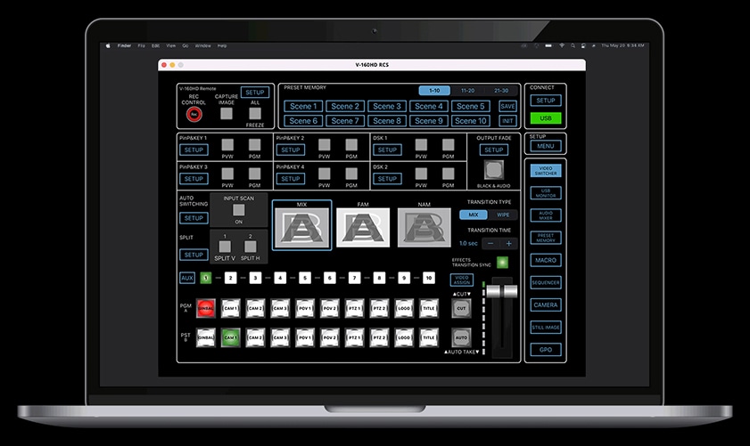 macOS/Windows用リモート・コントロール・ソフトウェア V-160HD RCSはUSB、RS-232、有線LAN、または無線LAN(Wi-Fi)接続したPCからV-160HDをリモート・コントロールするためのアプリケーションです。V-160HD RCSはUSB経由で配信用ソフトウェアと同時に実行できるので、1台のPC上で映像と音声の切り替えと配信を管理することが可能です(*)。