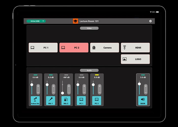 iPad専用リモート・コントロール・アプリケーション「V-160HD Remote」を使えば、Bluetooth、USB、無線LAN(Wi-Fi)接続したV-160HDの切り替え、フェーダー操作による音声のミックスなどをタッチパネルで直感的に操作することができます。またシステム・プログラム Ver.3.00以降、USB Type-C搭載のiPad(*)で、V-160HDの入出力の映像のモニタリングや切り替えなどの操作が可能です。