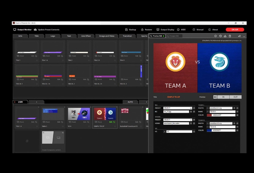 Graphics Presenterには、アニメーションのタイトルやスポーツのスコアボード、モーショングラフィックスなど、豊富なテンプレート をRoland Cloudから無償で提供。リアルタイムで編集可能なタイトルの入力や静止画取り込みなどにより、映像コンテンツをリッチに仕上げます。
