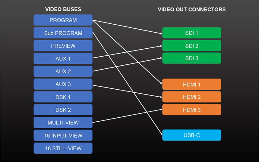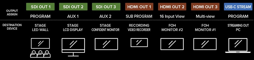 V-160HDは映像・音声の出力を自由に割り当てられる7つの出力系統(HDMI3系統、SDI3系統、USB-C1系統)を備え、出力先に応じた画面設定が可能です。 例えばPROGRAM OUTはライブ配信用に、ステージLEDや会場送り出しにはSUB PROGRAM OUT、演者確認用にはAUXを出力し、運営確認用マルチビューもすべてV-160HD一台で管理することができます。