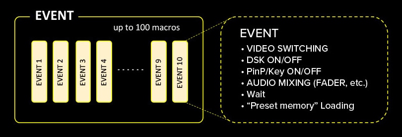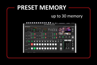 イベントやライブ配信の進行を円滑に進められるよう、画面構成や操作設定をあらかじめ登録したプリセット・メモリーやマクロを本体のボタンですぐに呼び出すことができます。
