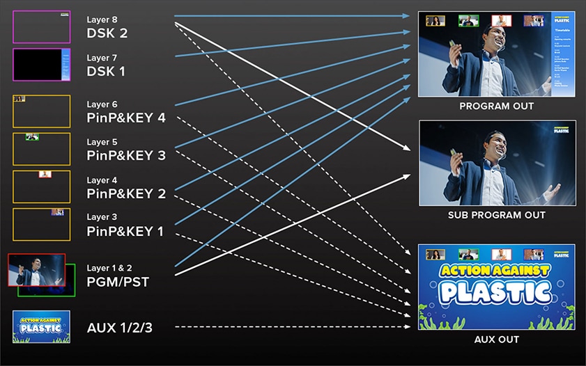 V-160HDは最大8レイヤーまで対応した映像合成と、最大4つのPinP&KEY(ピクチャー・イン・ピクチャー・アンド・キー)、2つのDSK(ダウンストリーム・キー)を使い、PROGRAM OUT とSUB PROGRAM OUT、3種類のAUX OUTの映像出力を作ることができます(*)。 またUSBメモリーから静止画を最大16枚まで本体に登録し、映像ソースとして使えます。アルファ・チャンネル付きPNG画像にも対応し、DSKのソースとして使えば、ライブ配信中のロゴ出しなどにも活用できます。
