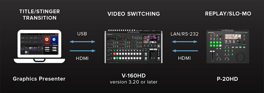 P-20HDとV-160HDを組み合わせることで、さまざまなスポーツに対応するスイッチング/送出/リプレイ・システムを構築できます。V-160HDのHDMI出力の1つをAUXバスに設定してP-20HDに入力。V-160HDでリプレイしたい映像ソースをAUXバスに設定することで、V-160HDとP-20HDを組みあわせたシステムが完成します。P-20HDでの映像再生とビデオ・スイッチャーの入力の切替が連動するため、操作手順を減らすことができます。 また、これにGraphics Presenterを組み合わせることで、動画再生およびスローモーションの前後に魅力的なスティンガーの切替効果を追加できます。