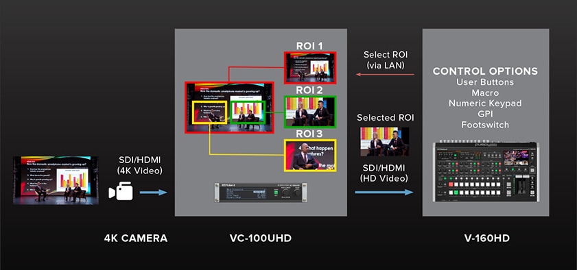 V-160HD Ver. 3.3以降とVC-100UHDをLANケーブルで接続することで、V-160HDからVC-100UHDで設定されたROIの切り出しエリアの選択ができるようになりました。これにより、4K映像から任意のエリアをHD解像度で切り出し、スイッチングが可能となります。