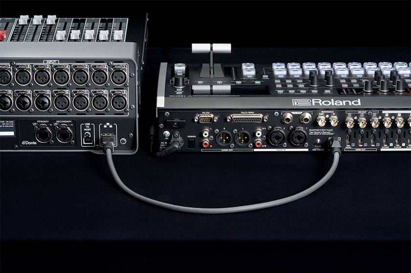 ライブ配信の現場でV-160HDとDM3を併用している場合、V-160HDからDM3のシーン・メモリーを呼び出すことが可能です。加えて、V-160HDに内蔵されたオーディオ・ミキサーの設定とDM3のフェーダー、ミュート・ボタンの動作の同期が可能。このシステムを構成することは簡単で、両機でIPアドレスの設定を行うだけです。この機能を使用するためのDM3シリーズ側でのファームウェアのアップデートは不要です。