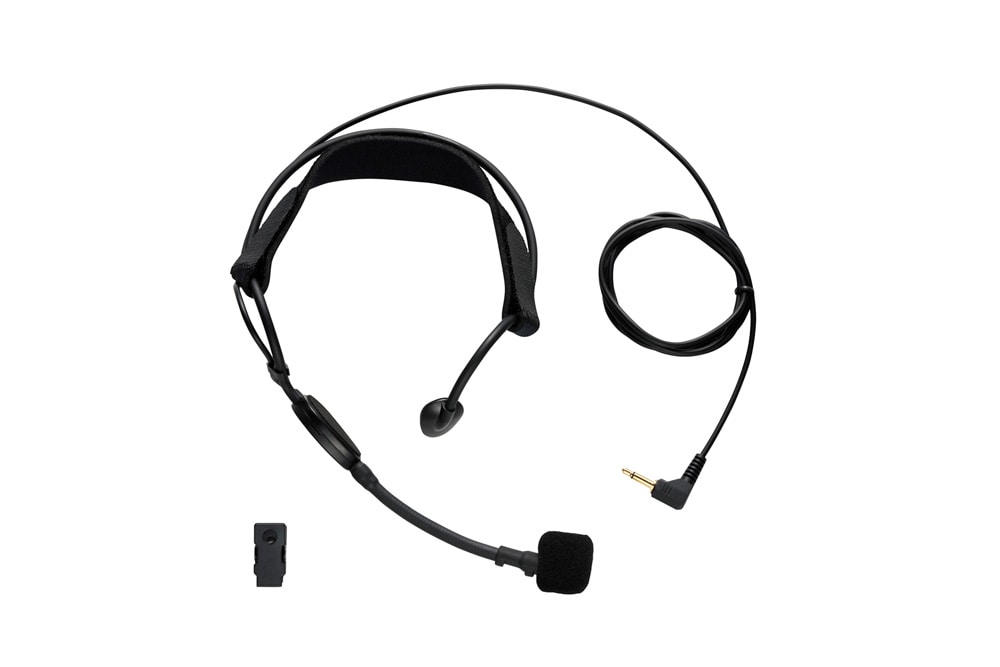 ハンズフリー拡声器と組合せて使用するヘッドセットマイク。軽量で、ヘッドバンドにより頭部にしっかりと固定可能です。