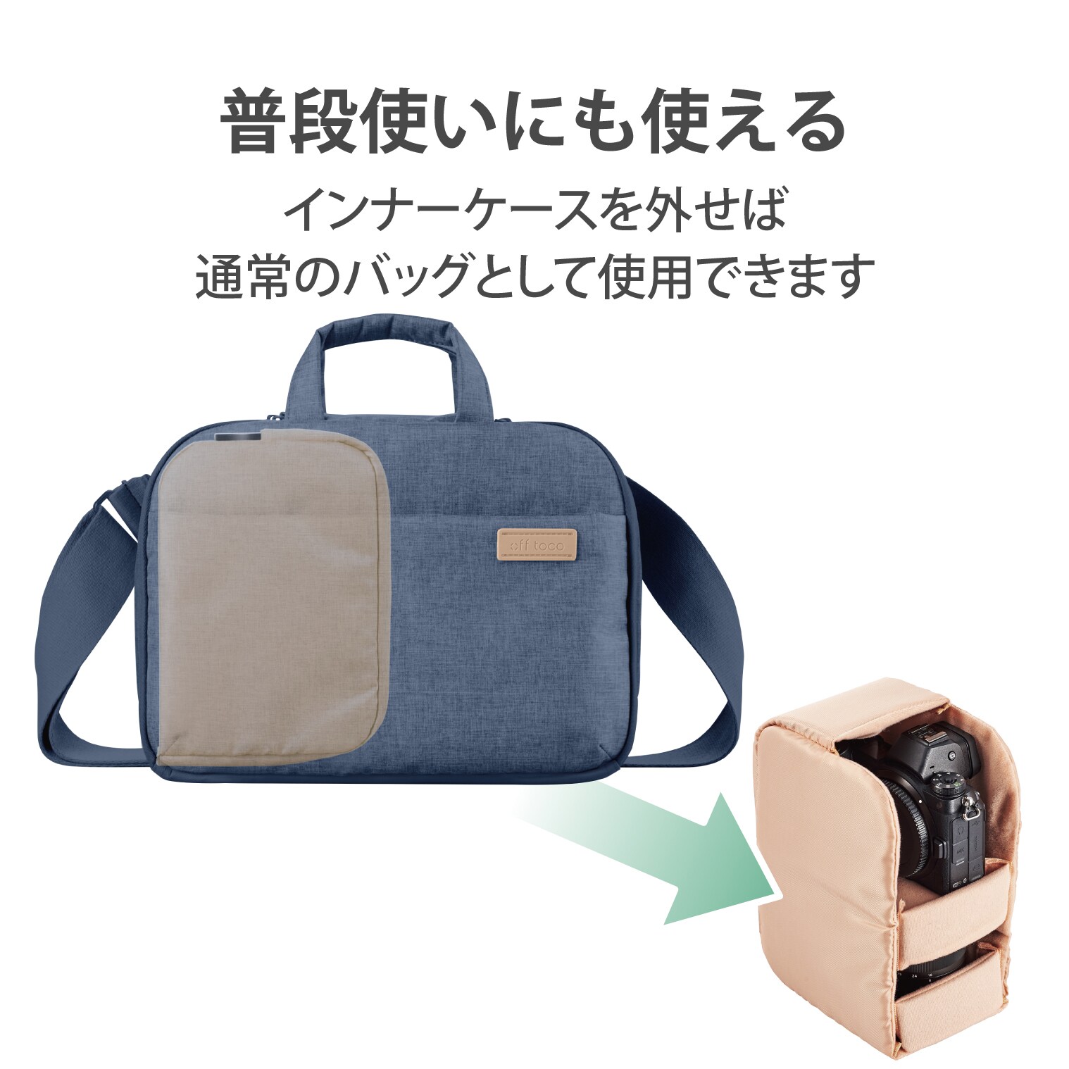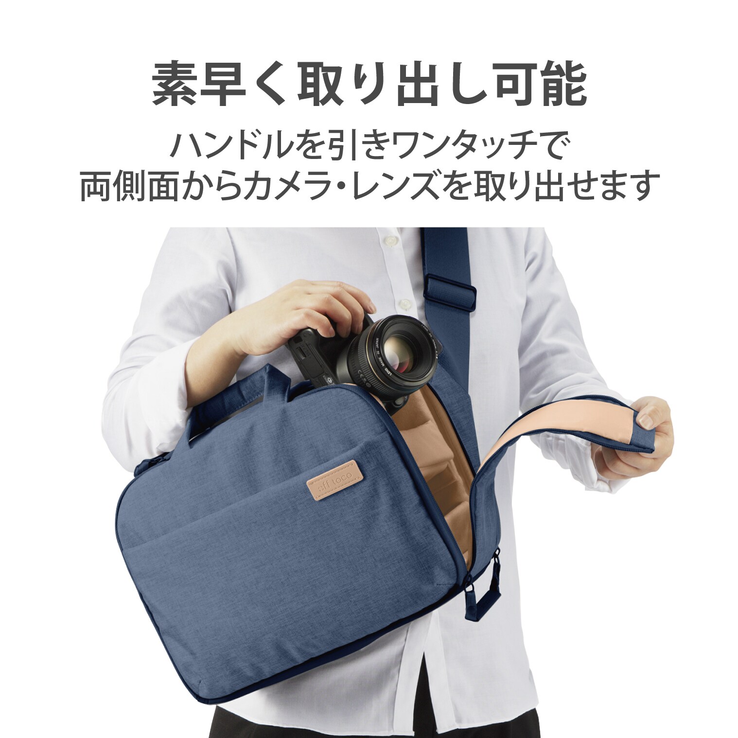 休日に持って出かけたくなるカメラバッグシリーズ“off toco”の2021年モデル。カメラを持って行くときはインナーケースをセットしてカメラバッグとして、カメラを持って行かないときはインナーケースを外して通常のバッグとして普段使いできる2STYLE仕様。ハンドルを引きワンタッチで両側面からカメラ・レンズを素早く取り出し可能です。