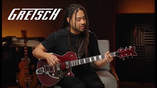クラシックでエレガンスに溢れるG6134TFM-NHは、ゴージャスなAmber FlameまたはDark Cherry Metallic Flameフィニッシュで、マッチングヘッド、べっ甲柄ピックガード、マザーオブパールのビッグブロックフィンガーボードインレイに加え、ジュエルアローノブ、Grover Imperialチューナー、バンジョーアームレストを含むニッケルハードウェアといった特徴的な仕様を備えています。Amber Flameフィニッシュにはべっ甲柄のヘッドストックロゴインレイが、Dark Cherry Metallic Flameにはクロームのヘッドストックロゴをフィーチャーしています。