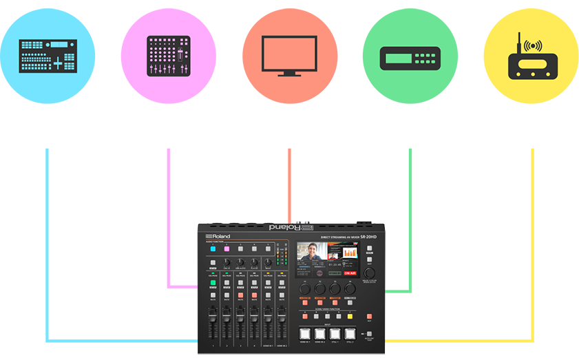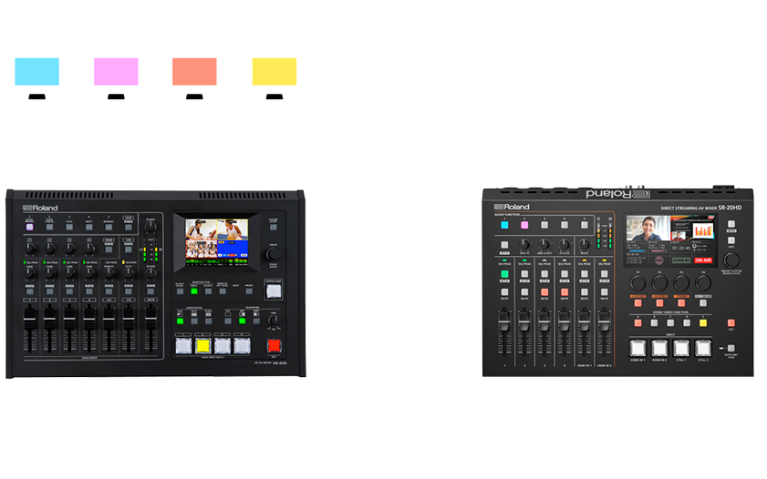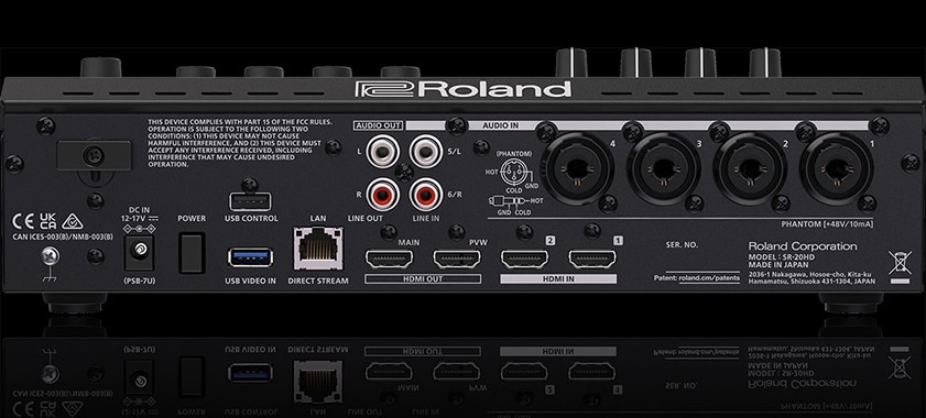 多くの映像入力が必要な場合、RolandのVR-4HDまたはUVC-01を使うことで入力数の拡張が可能です。SR-20HDのUSB VIDEO入力に高品質な非圧縮の映像、または音声を送出できます。
