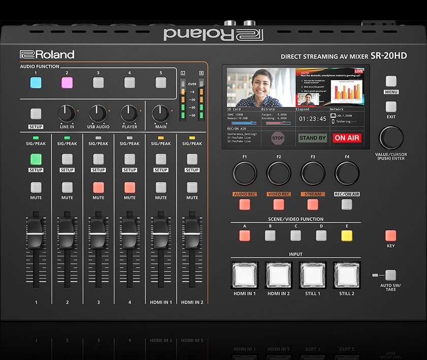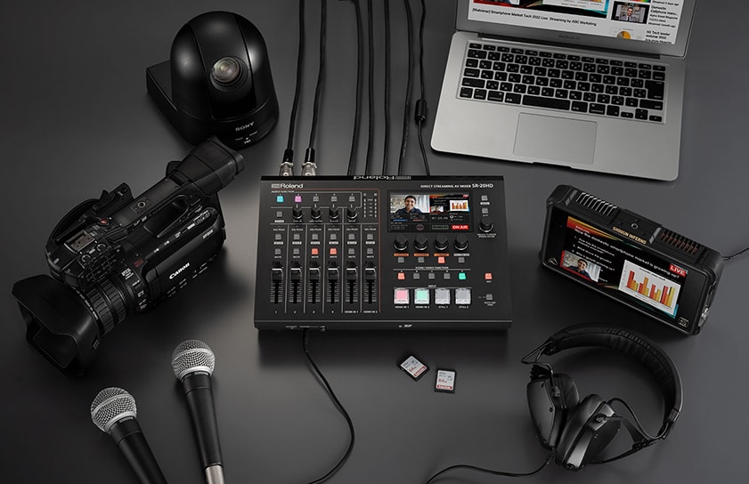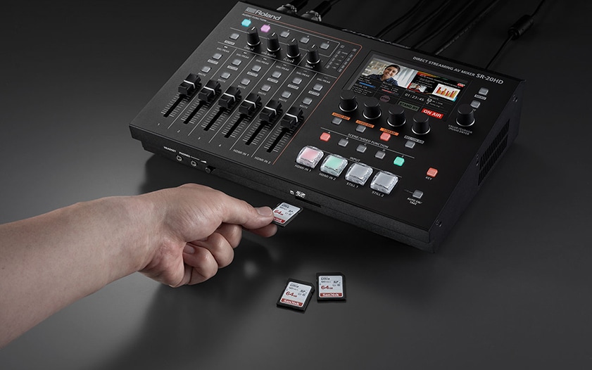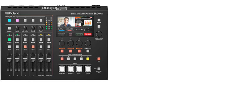 ダイレクト・ストリーミング・AVミキサー SR-20HDは、セミナーや発表会などのビジネス・イベントのライブ配信を簡単な操作で実現できる一台です。カメラやPCなどの機器を接続するだけで、LAN経由で複数のプラットフォームに直接配信できます。ライブ配信専用のPCを用意する必要はありません。また、SDXCカードに直接録画し、バックアップや後で編集してから公開することもできます。映像コンテンツ制作に必要な機能を一台に集約し、誰でも最小限のトレーニングで使用できます。SR-20HDは安全に、そして安定したライブ配信を提供するための一台です。SR-20HDは安全に、そして安定したライブ配信を提供するための一台です。