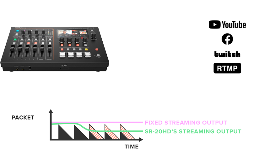 SR-20HD独自のアダプティブ・ビットレート機能は、ネットワークの接続状況をバックグラウンドで常時監視し、出力されるストリーミング・データを自動的に調整して、ライブ配信の中断を低減します。