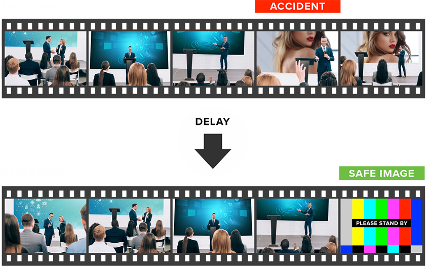 SR-20HDには配信中の予期せぬトラブルに備えた回避機能を搭載し、進行の台本などがないライブイベントでも安心して運用できます。セーフティ・ディレイ機能は、最大60秒の映像と音声のバッファを設定することができます。この間にアクシデントが発生した場合に、1つのボタンで静止画へ切り替えと音声のミュートを操作し、不適切なコンテンツが配信されることを防ぎます。