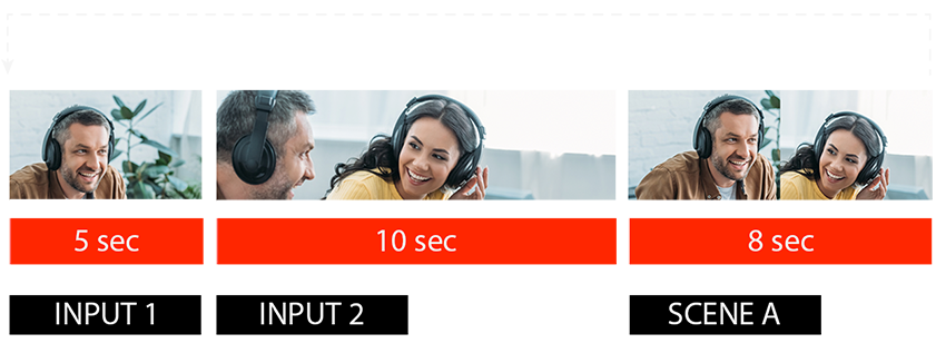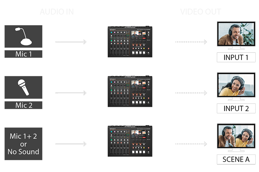 SR-20HDは、対談やディスカッションなど複数の話者がいるライブ配信の運用をサポートします。「オーディオ・フォロー・ビデオ機能 」は、映像の切り替えに応じて、設定された音声を切り替えます。また「ビデオ・フォロー・オーディオ機能」は、マイクに向かって話している人の音声に応じて、映像を切り替えることができ、映像と音声に連動した運用が可能です。