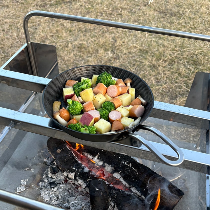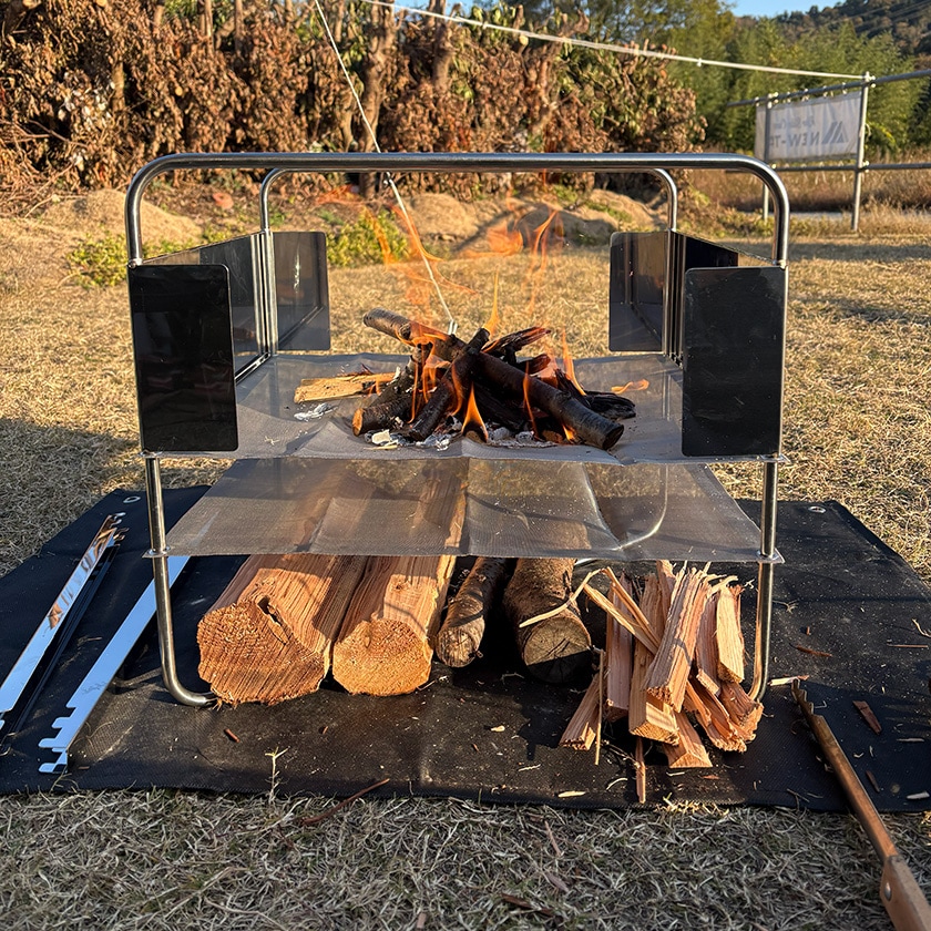 ステンレス繊維のメッシュ生地が薪と灰をキャッチする、軽くてスマートなたき火台です。