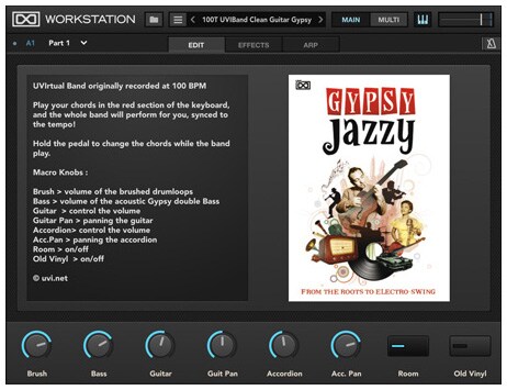 Gypsy Jazzy には、マルチサンプリングされたハイクォリティのドラム、ベース、リズムギター、バイオリン、クラリネット、アコーディオンが、ソフトウェア音源として収録されています。加えて、Gypsy Jazzy にはコンストラクションキットと UVIrtualBand による鍵盤操作で、バンドアンサンブルがテンポとコードにリアルタイムに追従します。気分や必要応じてラインを変更したり、熟練したプレイヤーのリズム演奏をアンサンブルに加えるなど、Gypsy Jazzy はそのニーズにお応えします。