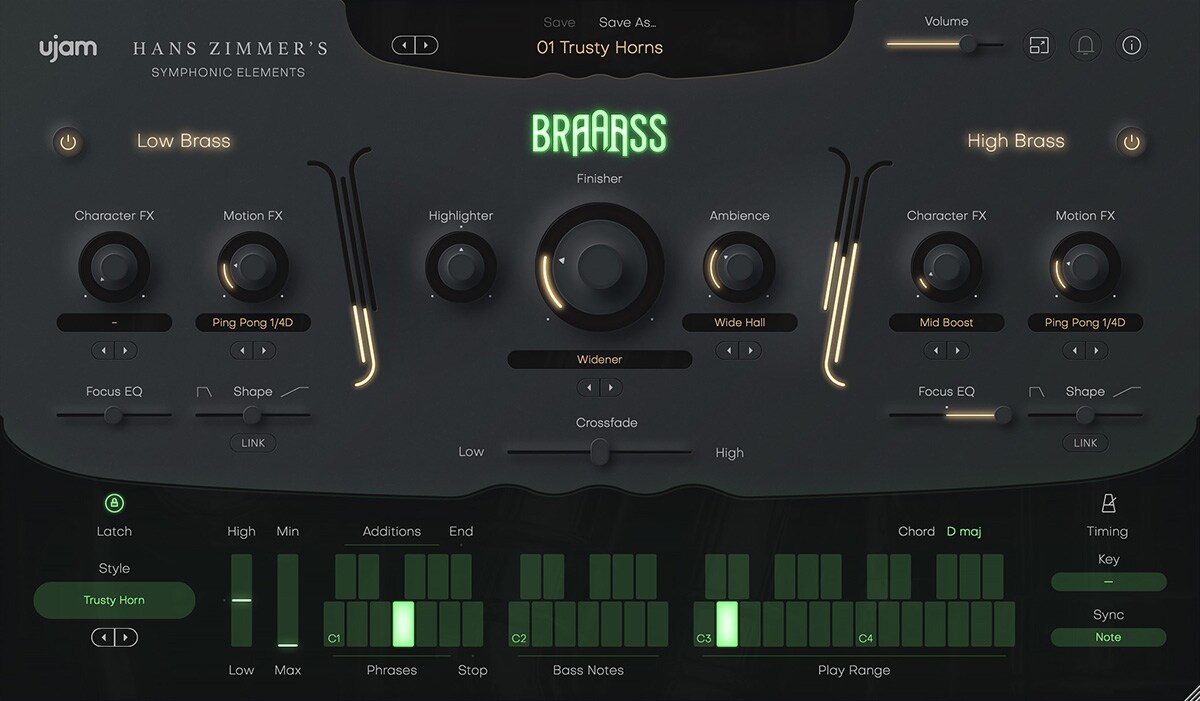 Symphonic Elements BRAAASSは、UJAMの共同創業者であり、そして映画音楽界の巨匠でもあるハンズ・ジマーが、長年にわたり集めた秘蔵のブラス音源を詰め込んだSymphonic Elementsシリーズ最新作。現代の音楽プロダクションに求められるものの扱いが難しいブラスを、より直感的で使いやすいものにします。 生のブラスを打ち込みで再現するにはとても時間がかかります。しかしUJAM独自のエンジンが提供する豊富なプリセットとクリエイティブなマクロコントロールがあれば、素早く簡単にブラスを仕上げることができます。DAWのテンポにも即座に同期され、細かい処理や調整を忘れて音楽に集中させてくれます。 映画音楽やシンフォニック音楽だけではなく、ブラスの多い近代的ラップまたはヒップホップなどにも使えるフレーズも多く搭載。それらとFinisherと掛け合わせると驚く発見があるかもしれません。