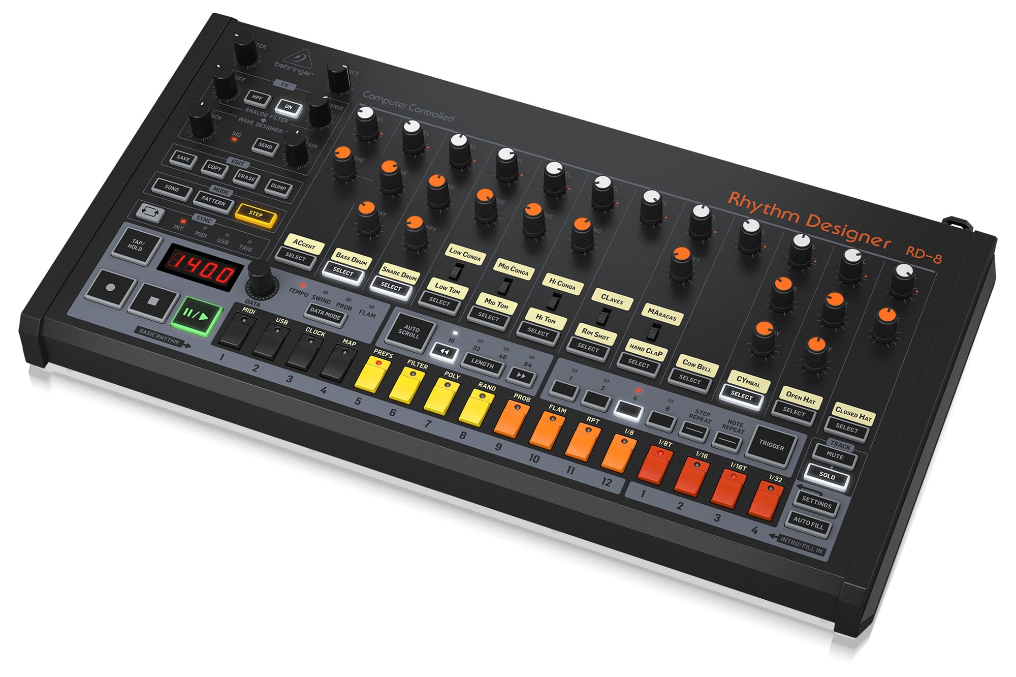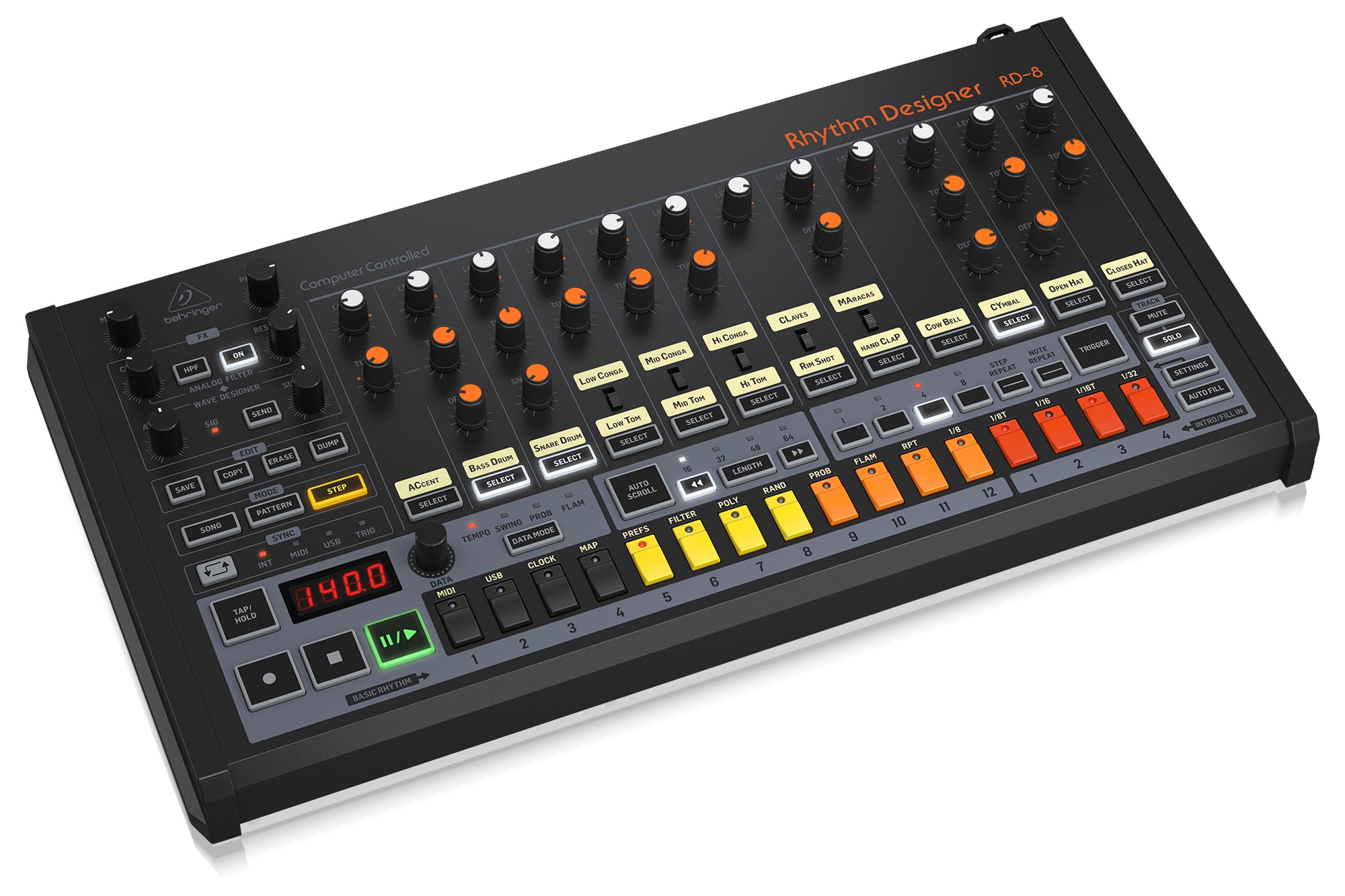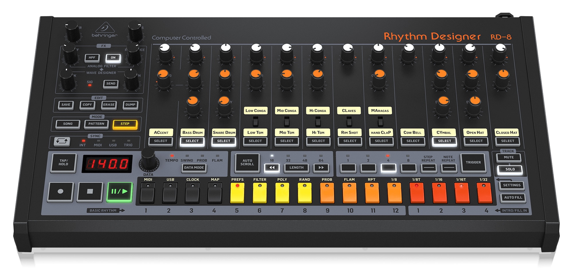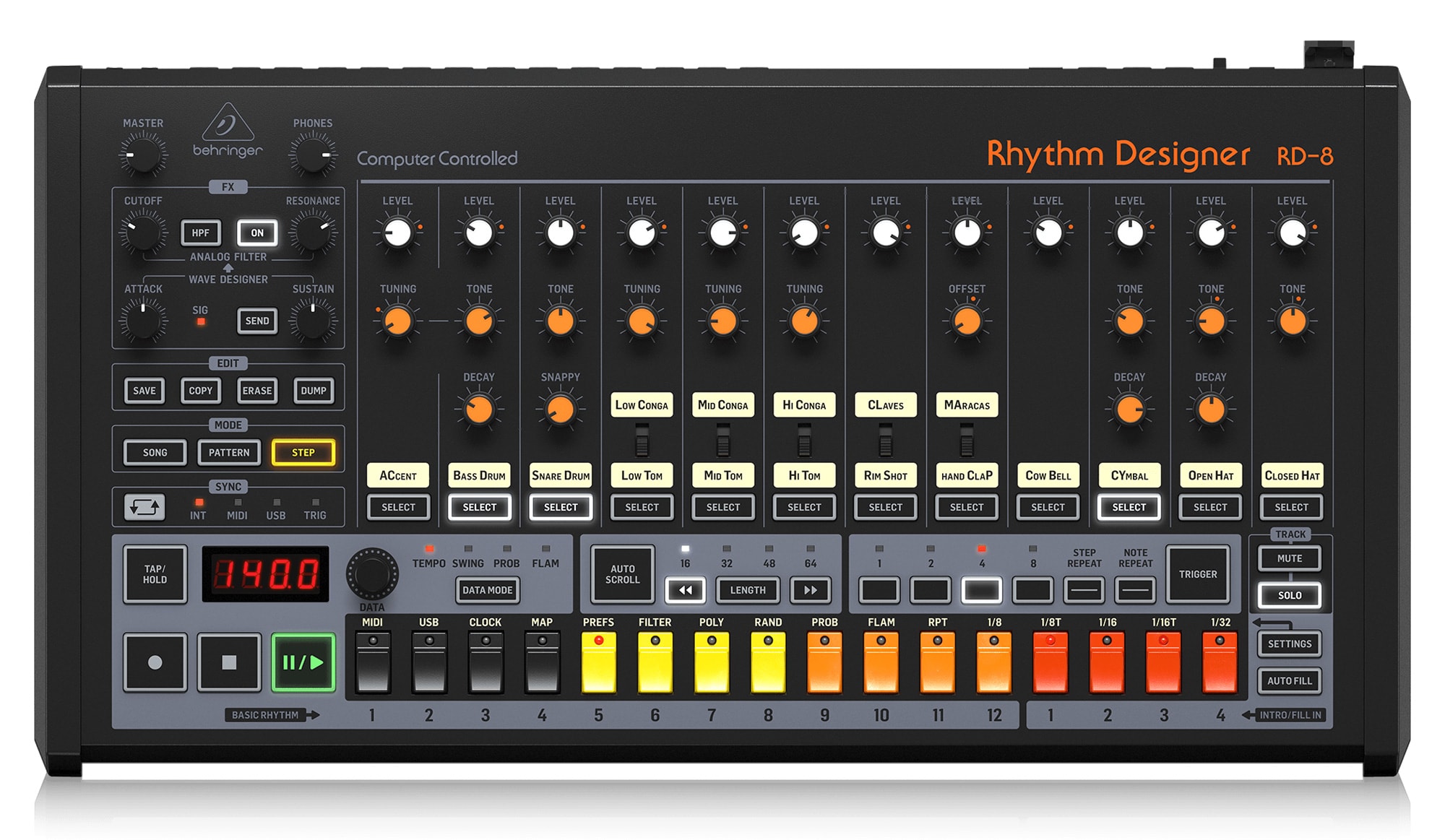 追加パラメータおよびグローバル・アクセント機能を備えた、16種類のオリジナル・ドラムサウンドを搭載。
